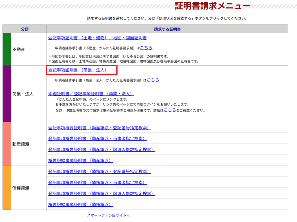 ログインするとメニュー一覧が表示されますので、「商業・法人」の「登記事項証明書(商業・法人)」のメニューを開きます。