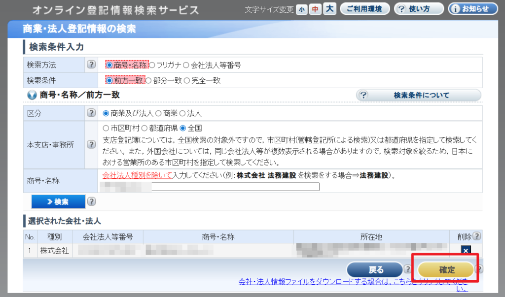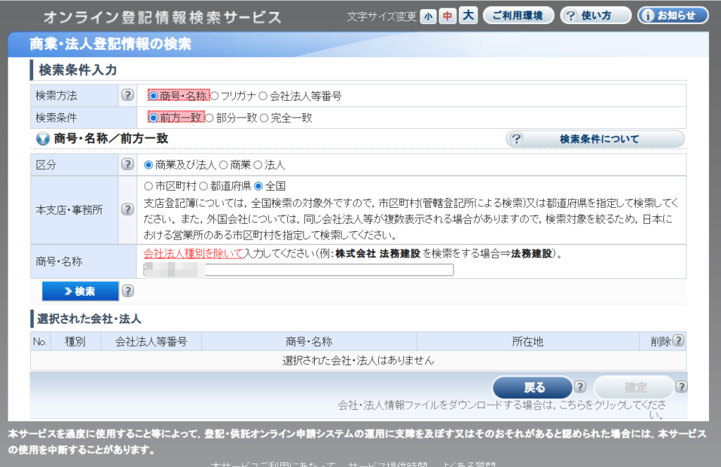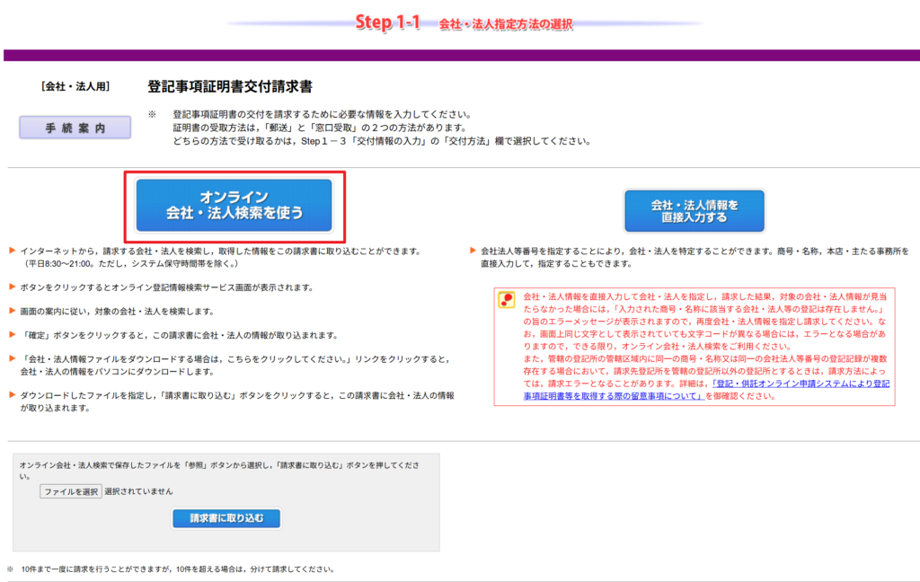 検索するか、直入力か、添付ファイルかの3択ですが、実質「検索」の一択ですので「オンライン会社・法人検索を使う」をクリックします。