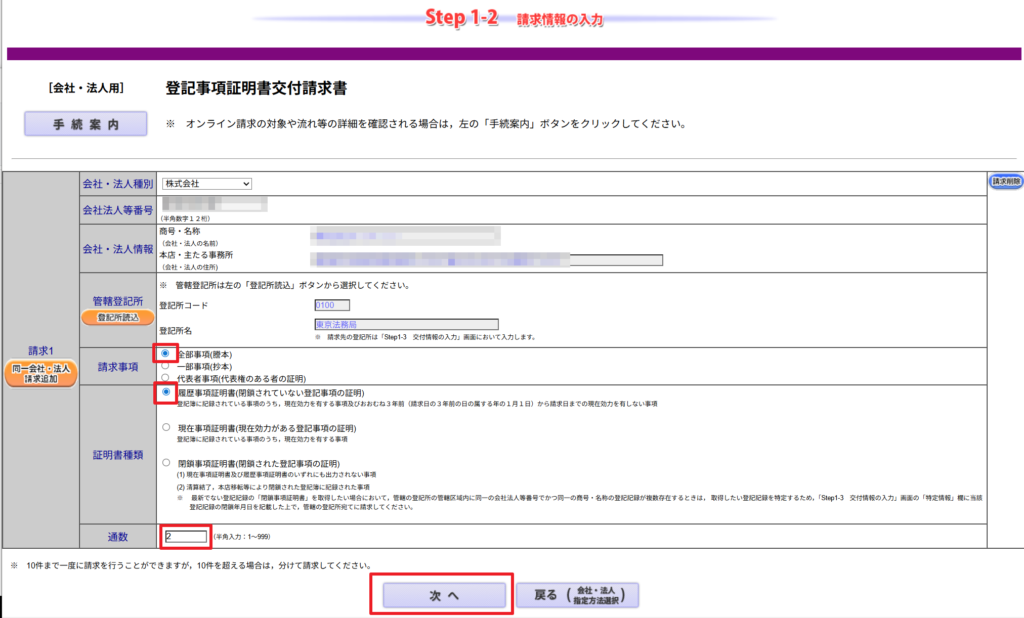 基本的に、「全部事項」「履歴事項証明書」で良いです。大抵の機関で求められる書類は「履歴事項全部証明書」だからです。通数は2枚だけ発行しました。