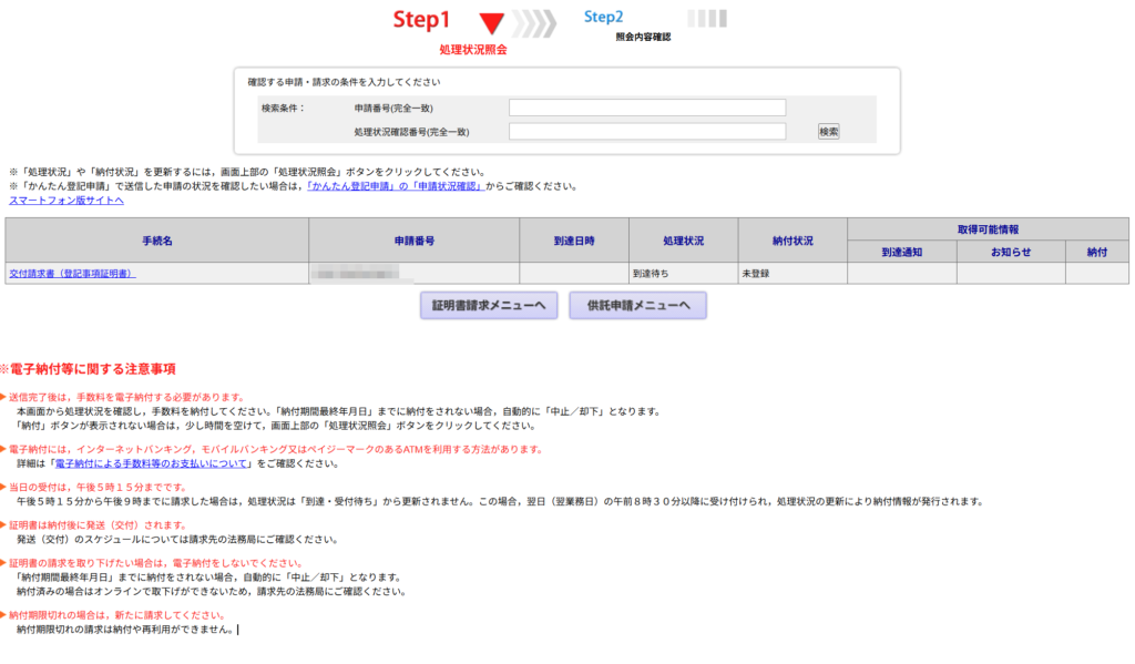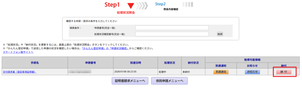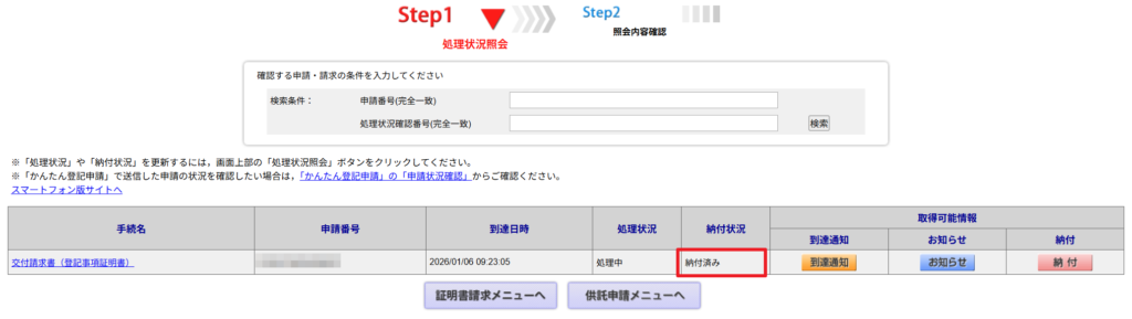 状態が納付済みになっていれば、申請処理ば全て完了です。
