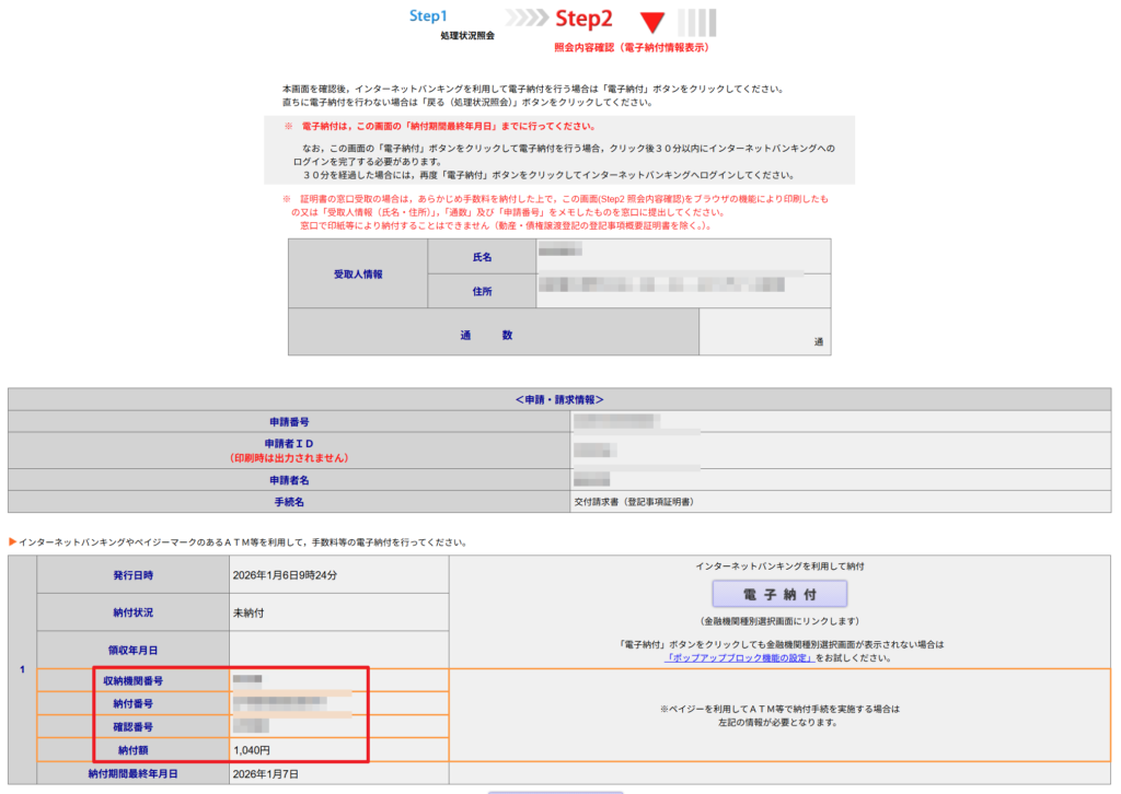 各情報(収納機関番号、納付番号、確認番号)を入力すると、以下のように確認画面が表示されます。