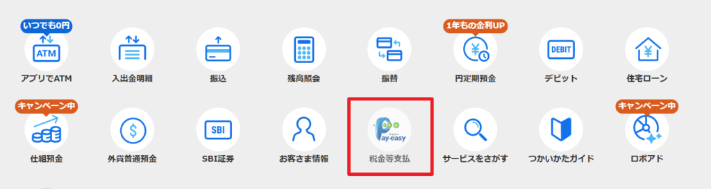 以下の画面は個人の住信SBIネット銀行のメニューです。自身の銀行口座のメニューをそれぞれ使用してください。銀行によってはPay-easyに未対応の場合もあるため、その場合は対応銀行を使用してください。